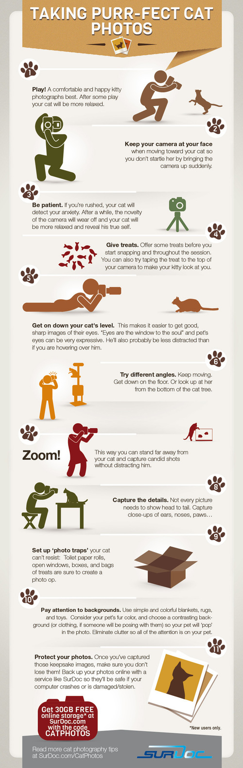 Do you ever wonder how do those cute cat photos are snapped? The infographic from Surdoc.com explores the basic steps to taking the purfect cat photos.
